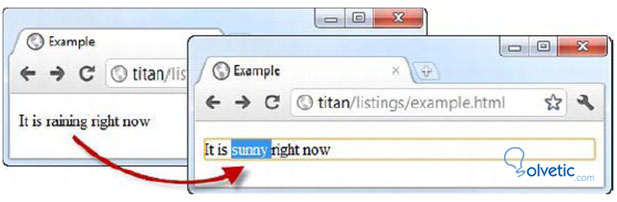 Hemos aplicado el atributo a un element <p> fijando el valor del atributo en “true” permitiendo al usuario modificar el contenido de ese párrafo. Cuando el usuario haga click en el elemento podrá empezar a modificar el mismo.