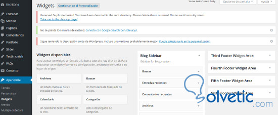 Para insertar un widget en una posición debemos arrastran con el mouse el widget desde la parte izquierda hasta la sección donde queremos incluirlo en la derecha. Por ejemplo en la imágen podemos observar que en la columna sidebar que aparecerá en la página Blog se han insertado los widget búsqueda, Entradas Recientes, Comentarios Recientes y Archivos.