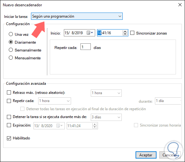 Allí podemos definir la frecuencia de la tarea de encendido: