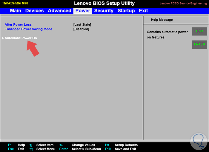 Allí seleccionamos la línea “Automatic Power On” y seremos redireccionados a la siguiente ventana: