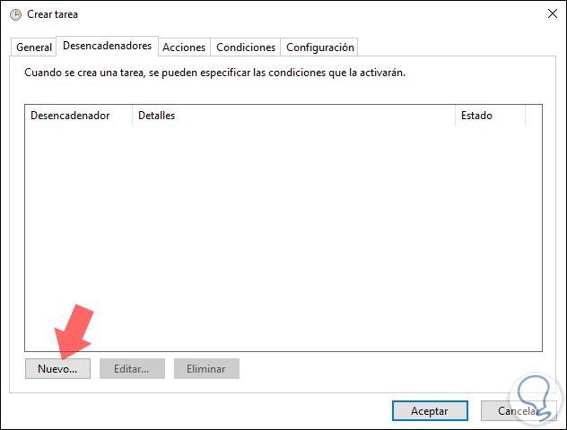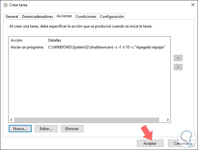 En la pestaña “Acciones”, que es donde definimos que ha de hacer Windows 10, seleccionamos Nuevo y allí ingresamos lo siguiente: