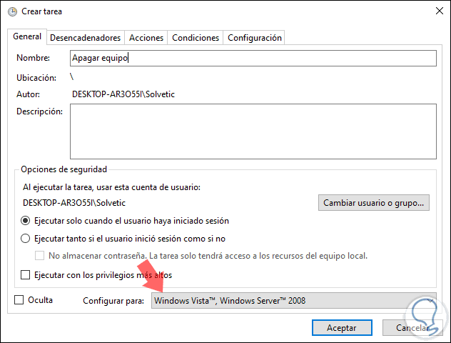 En la ventana desplegada asignaremos el nombre de la tarea, en este caso de apagado, en el campo Nombre y en el campo “Configurar para” validamos que esté la opción “Windows Vista, Windows Server 2008”: