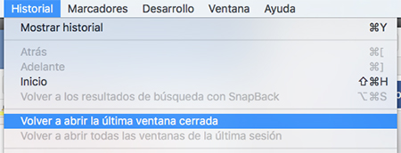 Lo primero que tenemos que hacer dirigirnos a Safari dentro de Mac y en el menú superior pulsar en Historial. Una vez aquí debemos seleccionar entre las dos opciones que aparecen. Volver a abrir la ultima ventana cerrada o volverá abrir todas las ventanas de la ultima sesión.