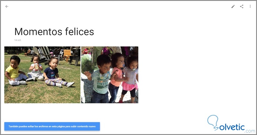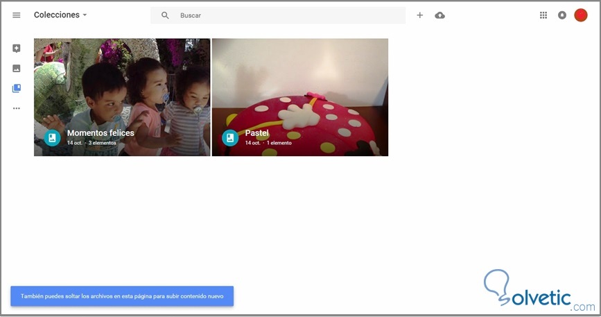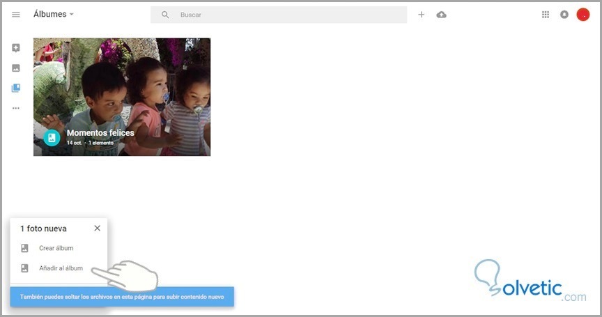 Para realizar las pruebas pertinentes a continuación como indica la imagen se arrastró una imagen a la interfaz, después de esperar algunos segundos a que la imagen se cargue exitosamente se visualizarán dos opciones: Añadir al álbum y Crear álbum para los efectos de este tutorial se creó un álbum llamado Momentos felices.