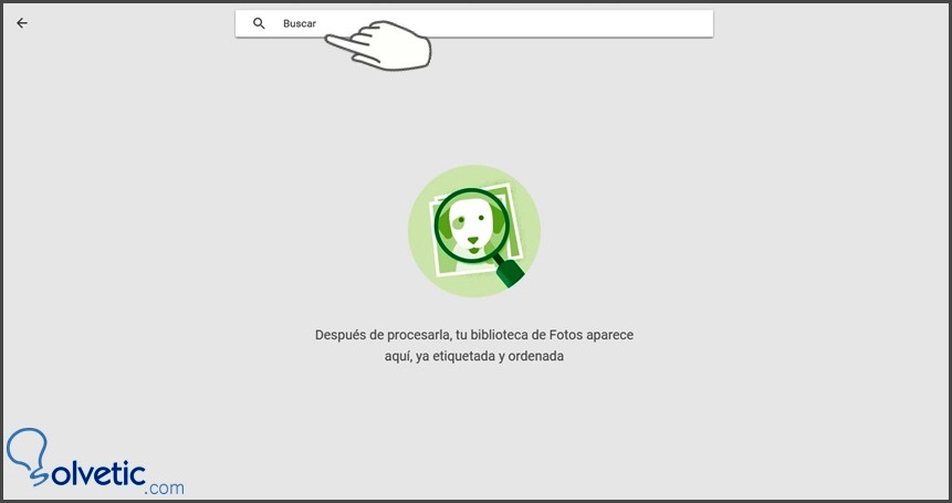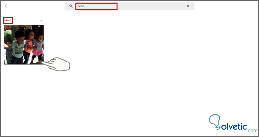 Para realizar búsquedas debe situarse en la barra superior de la interfaz, después de procesar la información la biblioteca de fotografías se ordena automáticamente por fecha. A continuación se iniciará un proceso de búsqueda con la palabra bebé para demostrar cómo el buscador inteligente arroja resultados relacionados con la palabra.