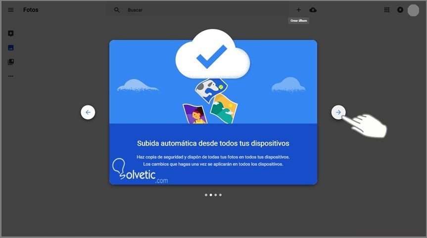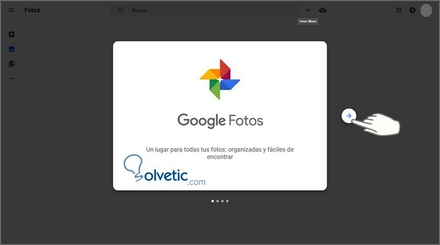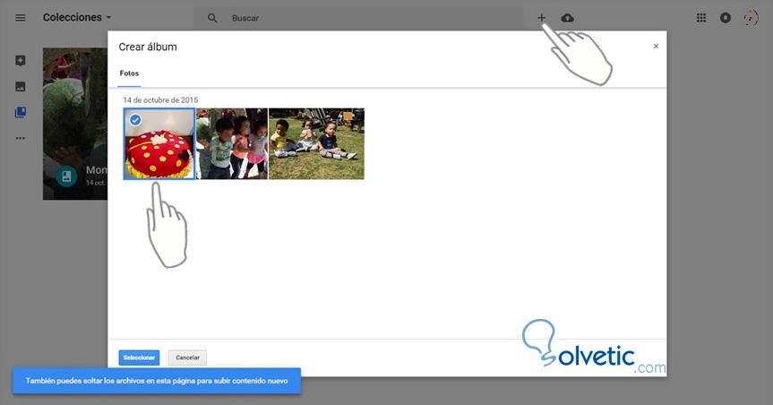 Usted podrá crear álbumes a partir de contenido ya almacenado incluso dentro de álbumes, debe pulsar el botón Crear álbum representado con una cruz, este se encuentra al lado de subir fotos ubicado en la parte superior de la interfaz. Seleccione el contenido que desea para aperturar el nuevo álbum y pulse Seleccionar.