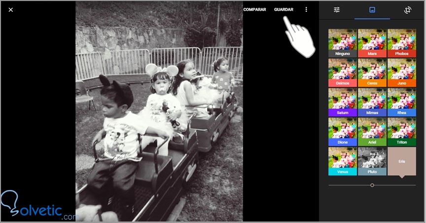 Representada con un lápiz esta función le permitirá realizar algunos cambios a la imagen tales como: color, brillo, recortar o girar, filtros, etc.