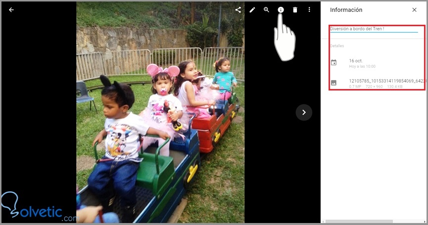 Representado con la letra i el cuarto icono información le brinda detalles sobre la imagen o video que se está visualizando, nombre del archivo, fecha, hora y podrá agregar una descripción.