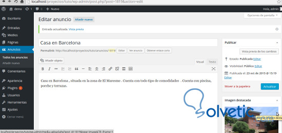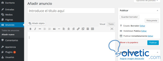 Cuando creemos un nuevo anuncio usaremos los campos que definimos donde el título del anuncio que escribiremos luego se verá en el listado. El texto del anuncio que redactaremos en el editor será el contenido y además podremos asignar una imágen que será la imagen destacada que podremos añadir al anuncio.