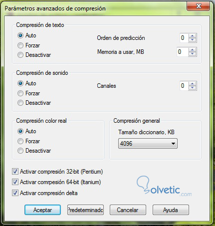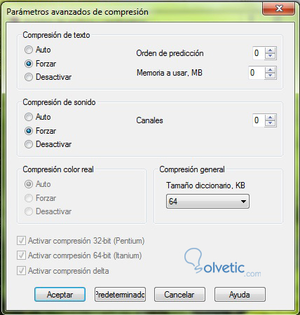 - “Compresión general” "Tamaño diccionario, KB” 64