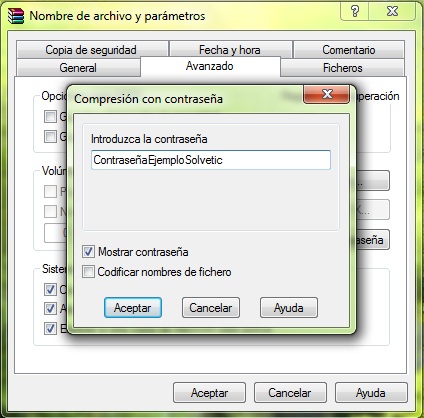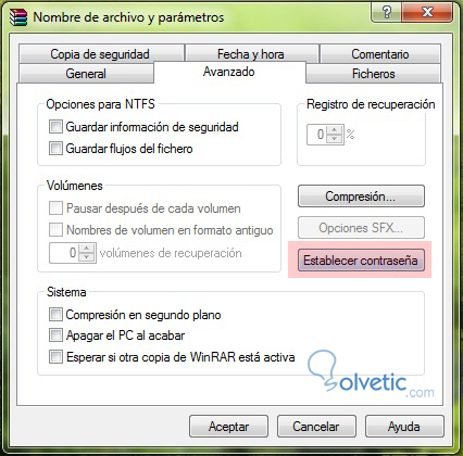 En el caso de que queramos introducirle una contraseña al archivo final, dentro de la pestaña “Avanzado” le damos clic al botón que se denomina “Establecer contraseña”, escribimos la que deseemos y luego damos clic en aceptar.