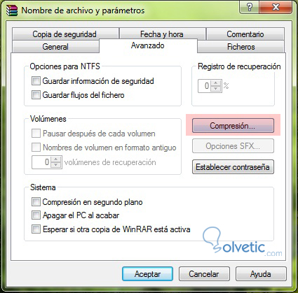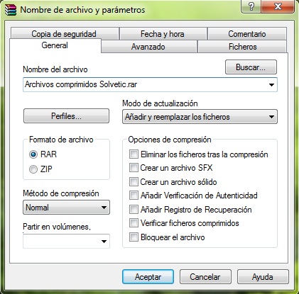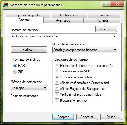 - “Opciones de compresión”: Tildar “Crear un archivo sólido”
