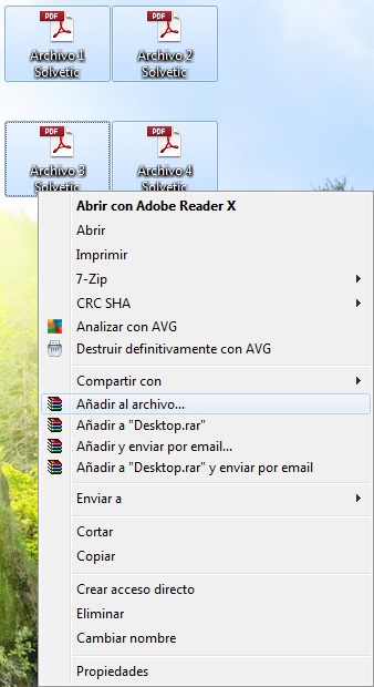 Lo primero que hay que hacer es obtener el programa WinRAR, que es uno de los programas encargado de realizar todas las compresiones y descompresiones de archivos en Windows. Una vez que lo tengamos instalado en nuestro ordenador, nos dirigimos a los archivos que queremos comprimir, los seleccionamos todos (o en su caso una carpeta que contenga a los archivos) y pulsamos clic derecho. Se nos desplegará un menú con opciones, y seleccionaremos “Añadir al archivo…” (opción que no verán si no poseen instalado en su pc el programa WinRAR).