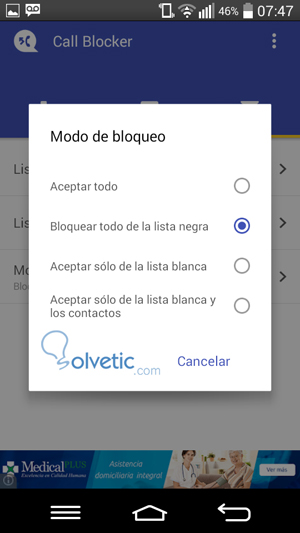 3. Aceptar sólo de la lista blanca: Bloquea todos los mensajes y llamadas entrantes de números exceptuando a los números agregados en la lista blanca.