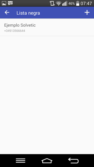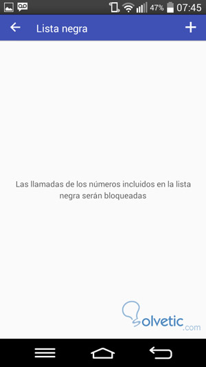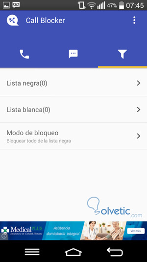 Para bloquear un número, simplemente nos dirigimos a la tercera ‘pestaña’ (la que el ícono se parece a un matraz Erlenmeyer dado vuelta, o un embudo). Allí aparecerá lo siguiente: