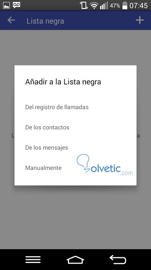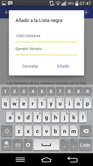Le damos al botón de “+” ubicado en la parte superior derecha y añadiremos el número del cual no queremos recibir llamadas ni mensajes. Podremos seleccionar el número desde los mensajes que tenemos en nuestra mensajería, de las llamadas del registro de llamadas, del grupo de contactos, o introducirlo manualmente. En nuestro caso lo introduciremos manualmente.