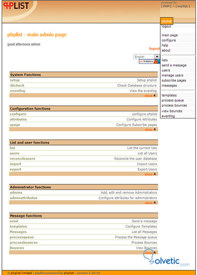 El panel de administrador de phplist tiene muchas opciones, para crear usuarios,, realizar mantenimiento de base de datos, configurar los envío en tiempo y cantidades, el idioma de la interface, Tabien deberemos generar una clave para el admin para validar y hacer estadisticas con los email.