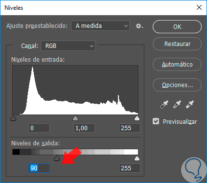 Una vez dentro de los niveles, tenemos que seleccionar en niveles de salida una subida de 90% en este caso. Hay que tener en cuenta la luminosidad de la fotografía y el efecto de niebla que queremos dar.