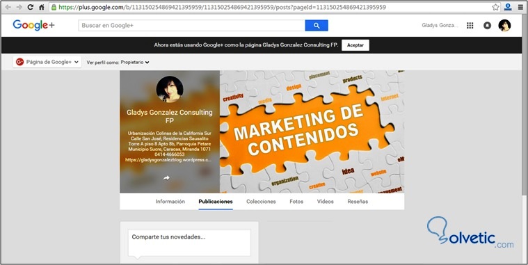 Panel de control de tu página de negocio de la plataforma Google+. Inicia sesión y accede tu página de negocios tal como se muestra en la ilustración a continuación: