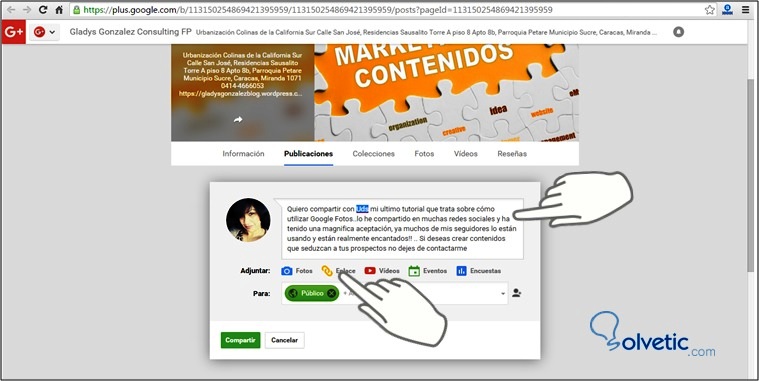 Crea una publicación recuerda que puedes incluir: fotos, videos, enlaces a otros sitios o al tuyo o también puedes crear un evento.