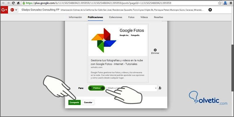 Selecciona tus círculos de contactos en el menú desplegable o también tienes la opción de seleccionar los nombres de contactos con las cuales deseas exclusivamente compartir la publicación. Para que la publicación sea visible en tu perfil público, haz clic en "Público". Cuando compartes algo públicamente, es posible que el contenido aparezca en resultados de búsqueda. Presiona sobre el botón Compartir.
