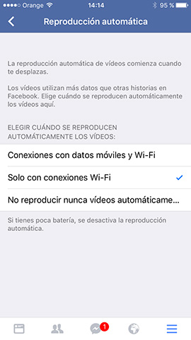 Dentro de las opciones disponibles podemos elegir que se reproduzca tanto con datos como con wifi, solo con wifi o no reproducir nunca automáticamente