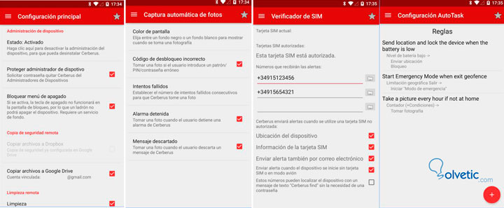 Alertas Automáticas: esta app tiene la capacidad de realizar acciones automáticamente cuando se cumplas ciertas condiciones. Por ejemplo, enviará alertas por correo/SMS cuando la SIM se cambie y te enviará al correo una foto de la persona que está manipulando el dispositivo cuando este ingrese código de desbloqueo incorrecto.
