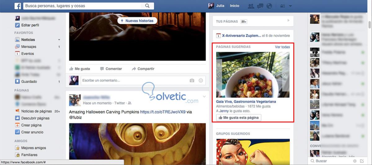 - Columna derecha de la computadora: Estos anuncios se encuentran a mano derecha de la columna principal de noticias como páginas sugeridas, grupos sugeridos o publicidad y tienen un formato de slider, con flechas a lado y lado que se activan cuando pasas el mouse por encima del ad, y que te permiten ver todas las sugerencias.