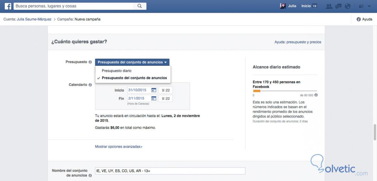 Allí puedes colocar el monto que desees, aunque Facebook te recomienda que asignes al menos 2$ para cada día de tu campaña.