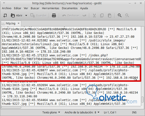 Veamos otro log donde donde detectamos accesos desde Google Chrome a la web de Solvetic.com.
