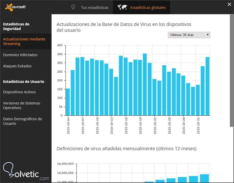 En la opción Estadísticas, podremos presenciar en tiempo real, los distintos escudos que avast aplica a nuestro ordenador. Incluso podremos ver las estadísticas a nivel mundial.