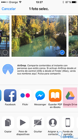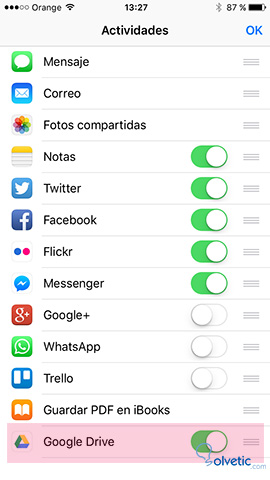 Cuando pulsemos en la parte superior derecha OK, vamos a volver al menú de compartir. Ahora podemos observar que la opción de Google Drive aparece ya en la lista de opciones.