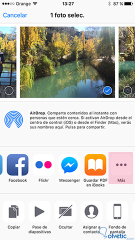Lo primero que debemos hacer es tener instalada la aplicación de Google Drive en nuestro teléfono o Tablet. Una vez instalada, si queremos habilitar esta opción, tenemos que seleccionar la imagen o imágenes que queremos guardar y dar al botón de compartir. Debemos seleccionar los tres puntos que aparecen en la parte derecha.