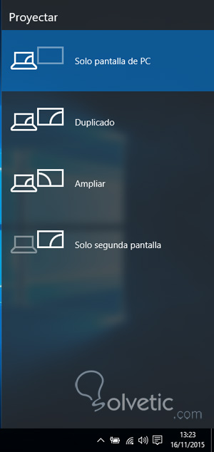 Lo que se puede configurar mediante Windows de las pantallas es la forma en la que actúa la segunda pantalla. Podes elegir entre las siguientes opciones: