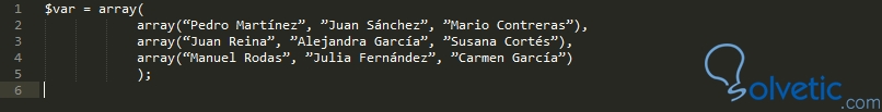 $var = array($valor1, $valor2, $valor3, $valor4, etc);Siendo $var la variable en la que guardamos el array y $valor1, $valor2… los valores que toma cada elemento del array.