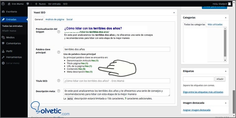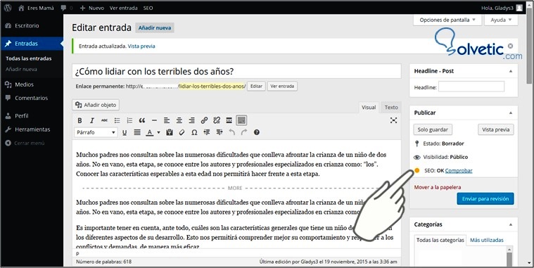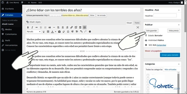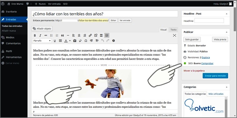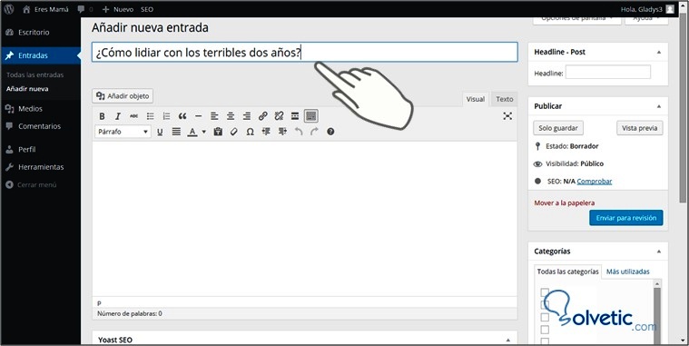 Es muy importante que tengas claro el tema que vas a postear, identifica las palabras claves con las cuales los usuarios en línea conseguirán tu articulo e inclúyelas en el título. En este caso el título es: ¿Cómo lidiar con los terribles dos años?, y las palabras claves: terribles dos años.A continuación, se muestra como hacer estos dos primeros pasos: