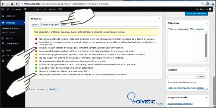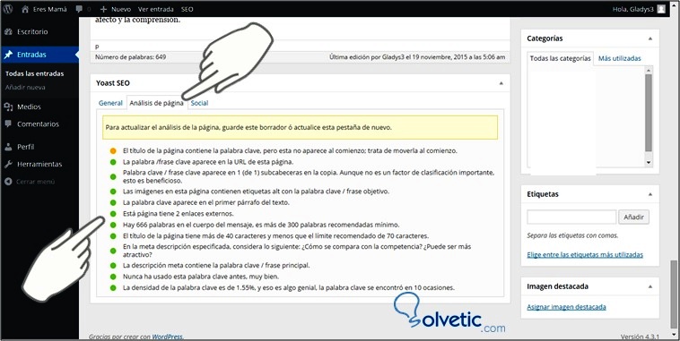 Apliquemos todos los correctivos, recuerda que es recomendable agregar 2 o 3 enlaces externos de páginas que tenga buen un buen Page Rank, tal como Wikipedia e incluir las palabras claves en el nombre de las imágenes. A continuación se aplican todas las sugerencias realizadas en el análisis, guardamos los cambios y verificamos nuevamente.