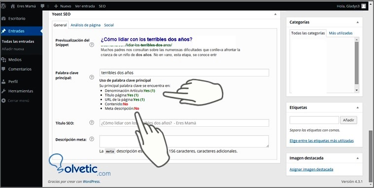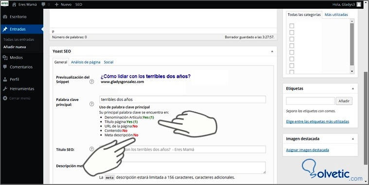Para visualizar esta validación colocaremos 2 veces la palabra clave y luego la completaremos.También es importante que se ingrese la meta descripción, redacta un resumen bien llamativo sobre lo que trata tu post en 156 caracteres o menos, si superas esa cantidad la herramienta te realizará la validación en tiempo real para que apliques los correctivos.Recuerda la importancia que tiene este punto porque es la invitación para que se visite el sitio.