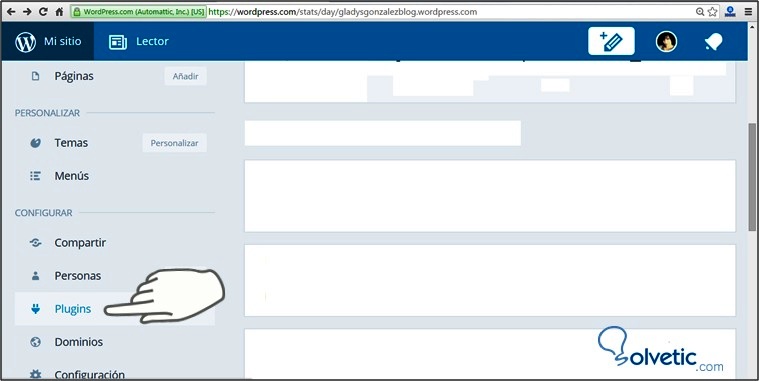 Inicie sesión una vez que entre a la solución presione sobre el icono Mi sitio y en las opciones del menú seleccione Plugin, tal como se muestra en la figura a continuación:
