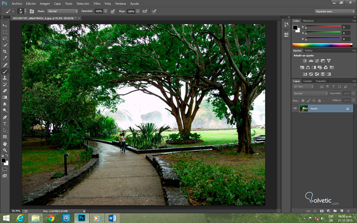 Tengo cargada en mi Photoshop una imagen tomada con una cámara común en un hermoso parque de Venezuela, llamado parque la llovizna, en la imagen podemos apreciar como el fondo se ve totalmente quemado por la luminosidad aunque allí en realidad deberíamos ver una cascada del rio Orinoco.