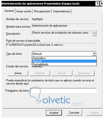 Allí se puede definir que el servicio se ejecute de manera sea manual, automática o bien deshabilitarlo (la deshabilitación se puede hacer en las aplicaciones o servicios que rara vez se utilicen).