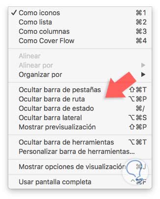 Es posible que lo que estemos buscando es personalizar nuestro Finder en cuanto a las preferencias de que es aquello que vemos en la pestaña principal. Para poder seleccionar esto, tenemos que irnos a la sección de visualización del menú principal y elegir entra las opciones disponibles. Como podemos ver en la imagen, tenemos opciones para mostrar pestañas, ruta, estado, herramientas...