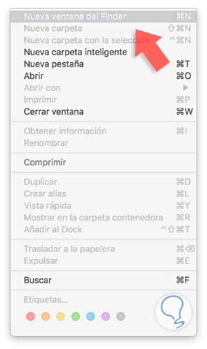 La primera pestaña con la que nos encontramos en el menú una vez que abrimos el Finder es la ventana de Archivo. En esta ventana vamos a poder realizar diferentes funciones. Si lo que queremos es crear una nueva ventana o abrir una nueva pestaña dentro del Finder tenemos que seleccionar el menú Archivo y elegir la opción de “Nueva ventana del Finder” o “Nueva pestaña”