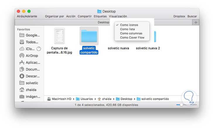 La visualización del Finder es muy importante para que estemos agusto mientras trabajamos con el. Las opciones de visualización son variadas. Podemos seleccionar si queremos que nuestros documentos se vean en iconos, lista, columnas o cover flow. Para seleccionar esto podemos realizarlo desde el propio menú del Finder en la parte superior “Visualización”.