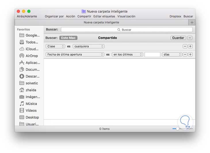 Otra de las herramientas que nos ofrece Finder, es la posibilidad de crear carpetas inteligentes para que de este modo podamos almacenar en ellas todos aquellos archivos que sigan el patrón que nosotros indiquemos. Se van a actualizar de manera automática por lo que nos facilitará el trabajo.