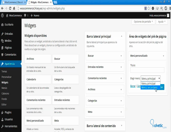 Una vez dicho esto ubicaremos en la izquierda de la pantalla la opción “Menu personalizado” y la arrastraremos hasta la opción “Area widget de pie de página” ubicada en la parte derecha de la pantalla.