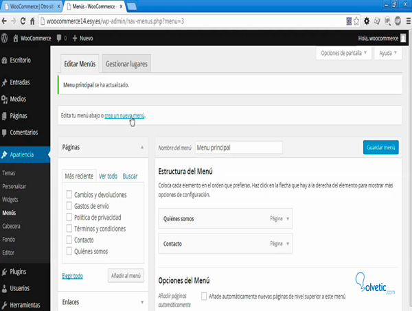 En esta ocasión me interesa colocar como opciones principales solamente las páginas “Quienes Somos” y “Contacto” mientras que las demás formaran parte del menú secundario. Por tanto comenzaremos creando nuestro menú principal, para ello ubicamos en el menú lateral izquierdo la opción Apariencia, hacemos clic en ella y posteriormente seleccionamos la opción Menú, tal como se muestra en la siguiente imagen.