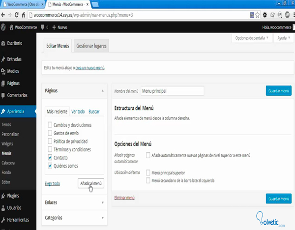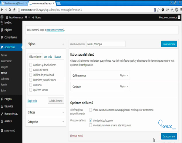 Una vez terminen de ordenar sus opciones no deben olvidar marcar la casilla con la etiqueta “Menú principal superior” la cual se encuentra en la parte inferior dentro del apartado “Opciones del Menú”