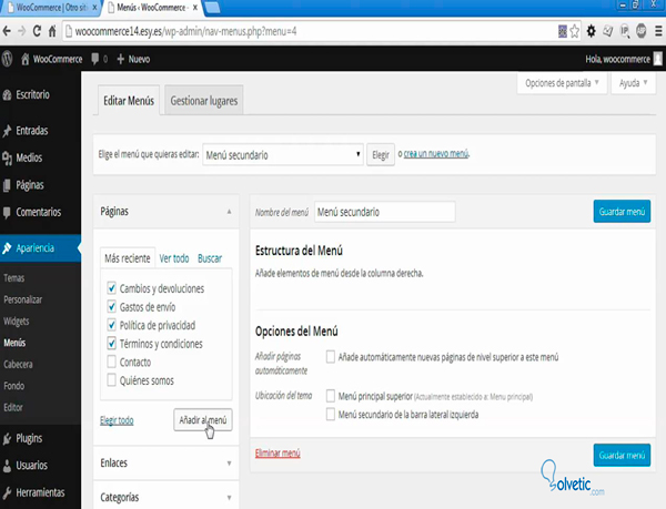 A este le colocare como nombre Menú Secundario y elegiré para el las demás paginas excepto aquellas que ya forman parte del menú principal.