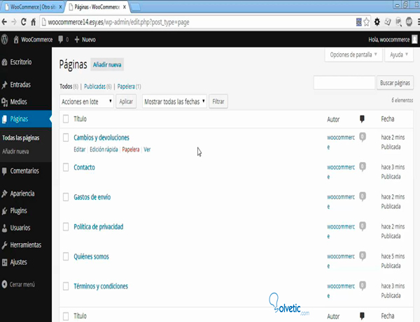 Como podrán ver en la imagen siguiente estamos dentro del menú Páginas de wordpress desde el panel de administración y ya hemos creado previamente varias páginas para que conformen nuestros menús.